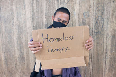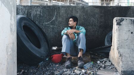 An Asian homeless man is sitting by the wall. His face is full of suffering, depression and despair. People are unemployed due to the effects of the corona virus outbreak.