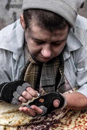 Homeless man is sitting down on walkway in town.He is receive dollar.He is hoping to have the better life. poverty, despair, Photo Sympathetic and hope concept.