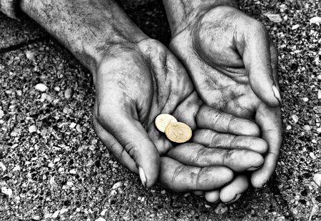 Closeup of hands of a beggar holding gold coins. Concept of poverty