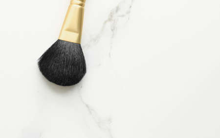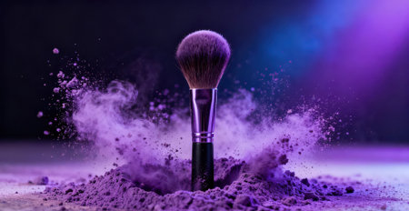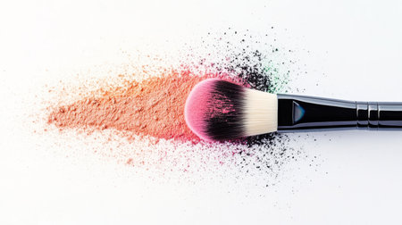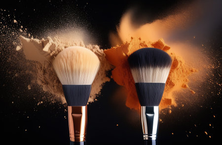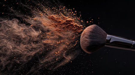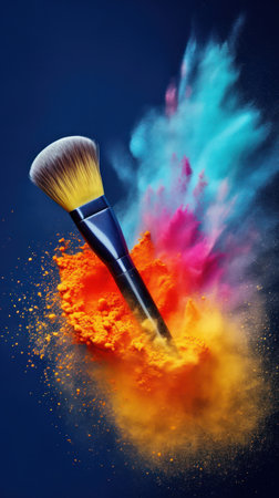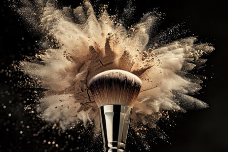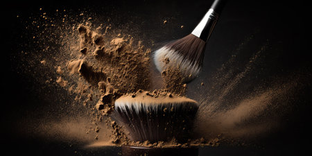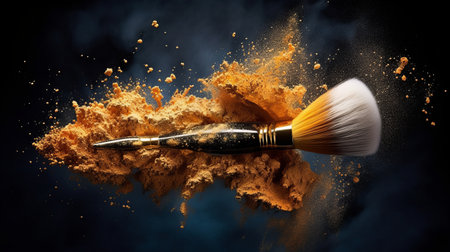 Make up brush on white surface, cosmetic makeup powder exploding as it impacts table