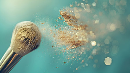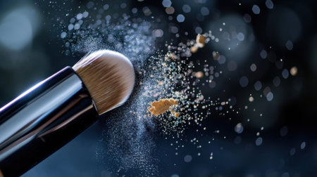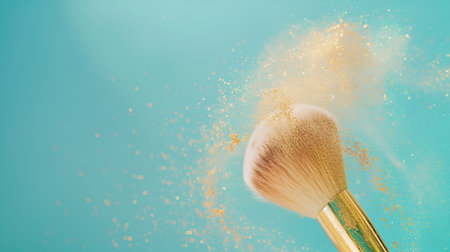 Cosmetics makeup brush and powder dust explosion background. Sequins fly