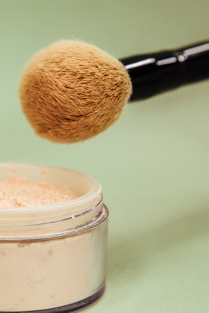 An elegant cosmetic brush rests on an open jar with a dry powder of a natural tone. top view. Beige background. A copy space. product advertising
