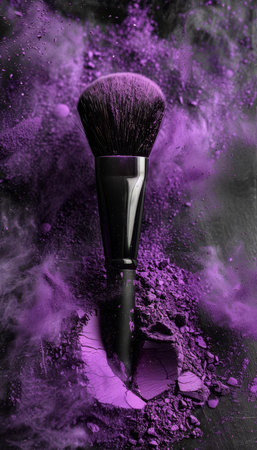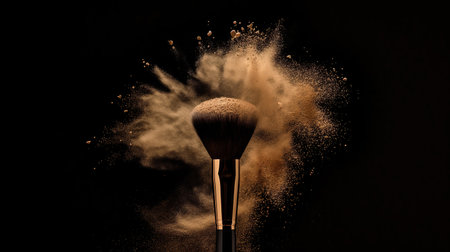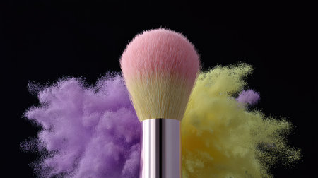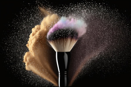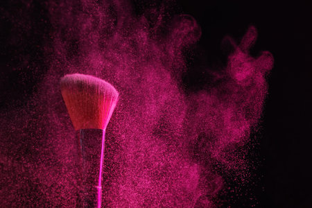 Makeup brush in colorful dust fog from powder explosion isolated on black background. Cosmetic and beauty art concept. Close up, selective focus