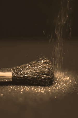 texture of gold glitter on the makeup brush and design. We have a black background. Selective Focus - Picture