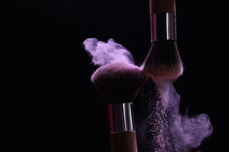 Makeup brushes with colorful powder explosion on black background. copyspace.