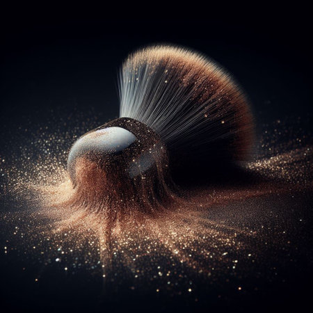 A delicate makeup brush, its bristles generously dusted with shimmering gold powder.