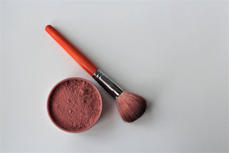 Blush, Blush brush. Kit pink makeup on white background, soft and selective focus, the concept of beauty