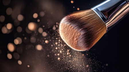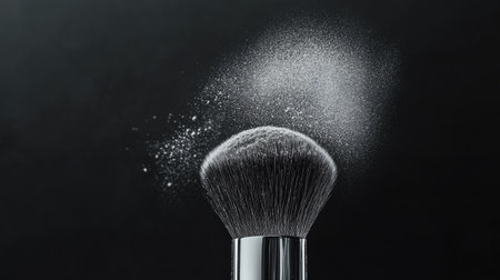 a detail of a powder brush, shaking off white loose powder, shot on black backgrownd.