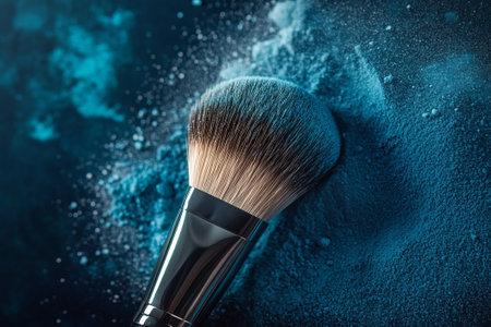 Two electric blue makeup brushes with powder dispersing from them against a black background, creating a stunning still life photography art piece capturing the beauty in darkness