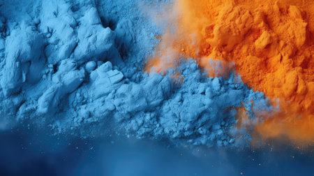 Fine particles of bright orange and deep blue powders interact, forming captivating shapes as they scatter in mid-air, showing beautiful color contrast.