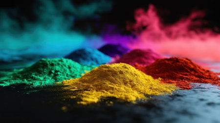 Beautiful blend of colorful powder particles scattered on a surface, creating a vibrant abstract art background, perfect for artistic or creative projects.