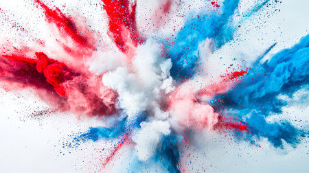A red-white-blue explosion of Holi colors. Powdery paints explode in the air and fly in all directions. Space background. A feeling of energy and excitement, as if from something powerful.