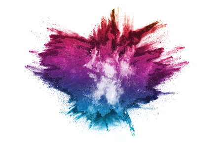 Explosion of colored powder isolated on white background. Colorful dust explosion.