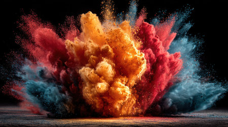 Vibrant explosion of multicolored powder against a black background, creating a dramatic burst of energy