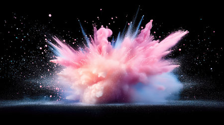 An energetic pink powder explosion creates a dynamic visual on a soft pink background, capturing the essence of creativity and celebration.