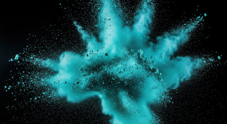 A vibrant cloud of fine cyan powder erupts and disperses in a stunning display of energy, creating an abstract and captivating visual effect.