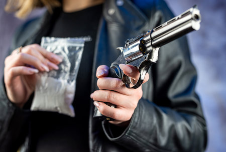female drug addict wear dark black clothes holding gun pistol and package with white powder. Illegal concept. Overdose