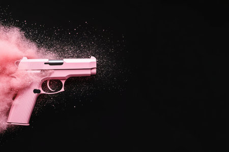 A black handgun is surrounded by a vibrant cloud of pink powder, creating a striking contrast against a dark background. The dramatic effect emphasizes both the weapon and the explosion of color.