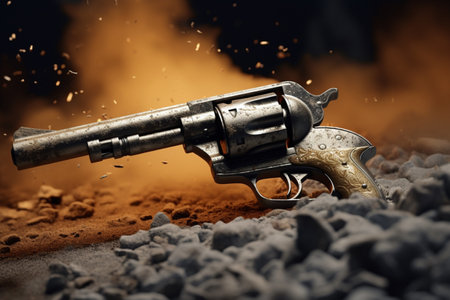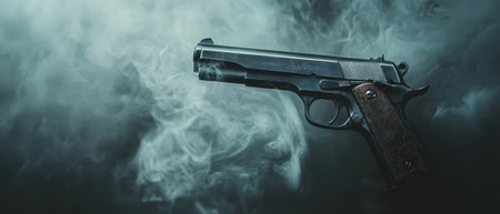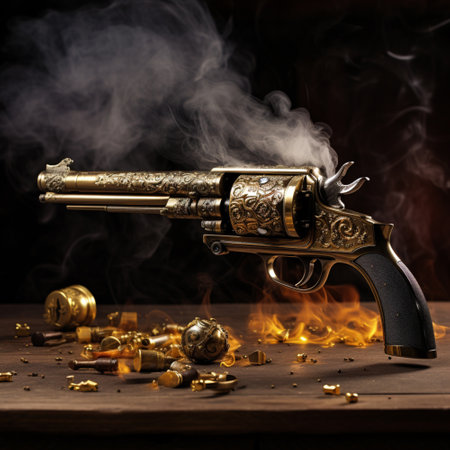 Intense close-up of a gun surrounded by gunpowder residue after firing. A high quality image making by generative ai.