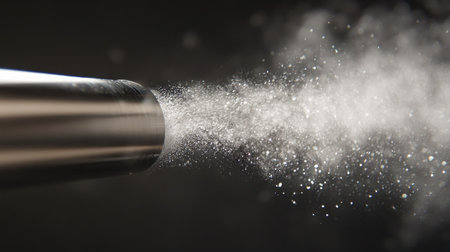Black spray gun spraying a cloud of shimmering particles