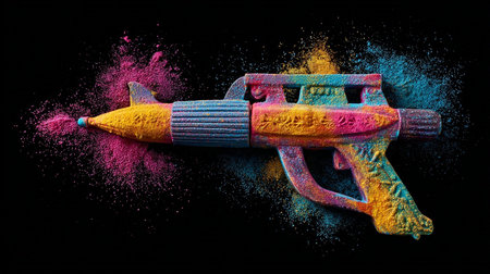 A pink gun bursts through colorful powder, creating a vibrant explosion against a dark background. The vivid colors enhance the striking visual, making it captivating and dynamic..