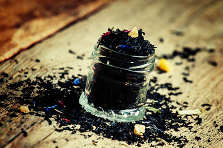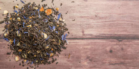 Dried black Earl Grey tea leaves over wooden background