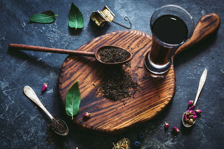 black tea dried leafs on spoon on wooden background
