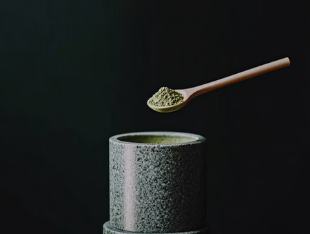 A serene image showcasing a rustic cup filled with herbal powder beside a spoon. The warm beverage on a textured surface invites a moment of calm and wellness.