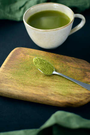 Heap of Green detox superfood powder (matcha green tea or spirulina powder) with a spoon on dark background, top view with copy space. Detox and healthy. Health care. Vegetarian food. Collagen