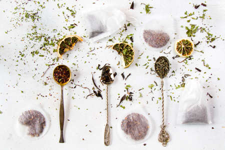Set of tea on the vintage silverware spoons, teabags and various of tea