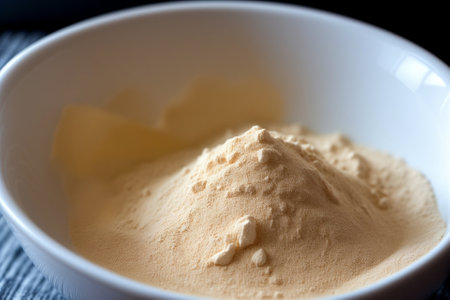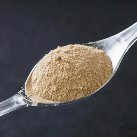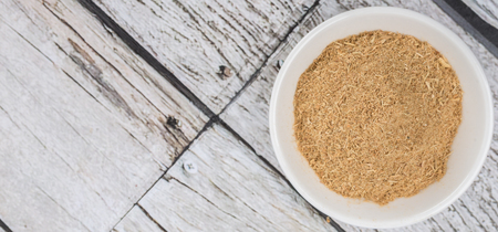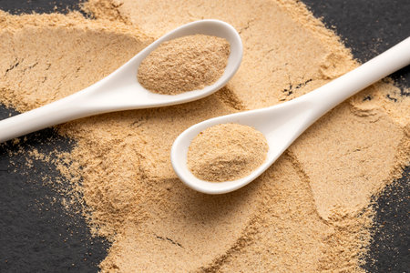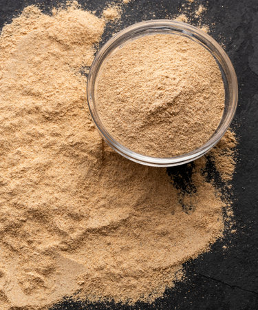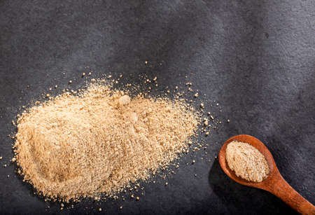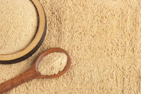 Nutritional yeast background. Nutritional inactive yeast in white spoon. Copy space. Top view. Nutritional yeast is vegetarian superfood with cheese flavor, for healthy diet. Vertical.