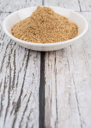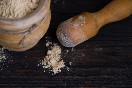 ashwagandha root (aka Indian ginseng) powder in a small ceramic bowl with a wooden teaspoon, superfood concept