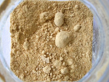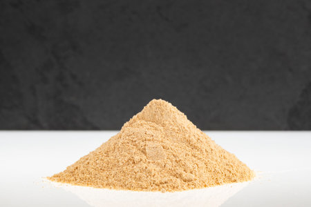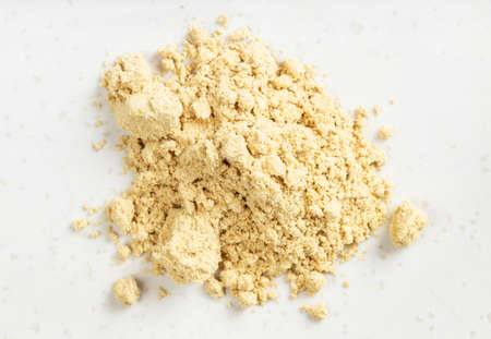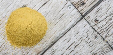 Nutritional yeast heap on white background. Nutritional inactive yeast top view. Copy space. Nutritional yeast is vegetarian superfood with cheese flavor, for healthy diet
