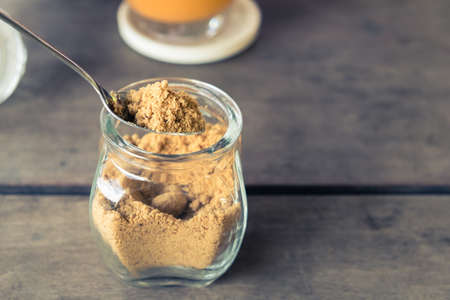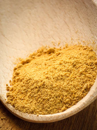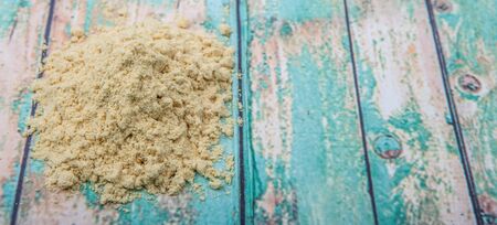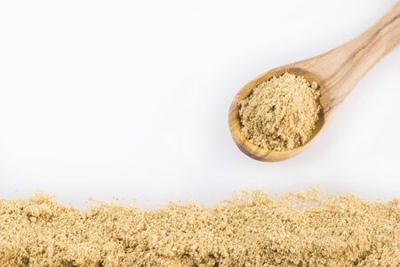 Pile of ground ginger on wooden spoon. Used as a delicacy, medicine or spice.
