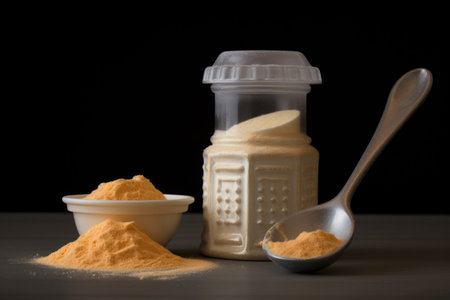 close-up of baby bottle, formula powder, and scoop, created with generative ai