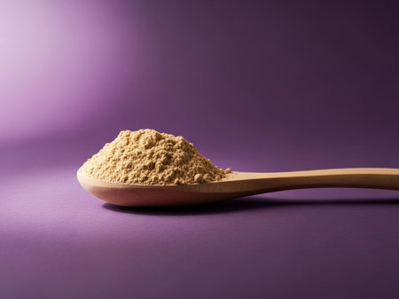 A wooden spoon filled with a heap of brown powder sits on a purple surface with a subtle gradient and shadows cast to the right, creating a moody atmosphere with warm tones