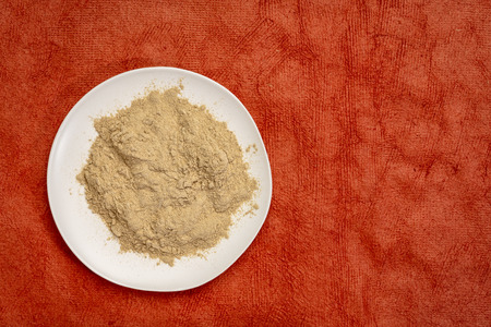 maca root powder on white ceramic plate against red textured paper with a copy space
