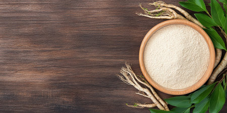 Ginseng root and powder in wooden bowl with green leaves on dark rustic surface.