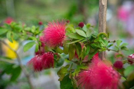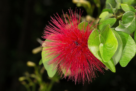 Red flower Calliandra haematocephala flower blooming in greenhouse.