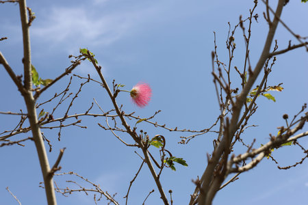 Flowering Persian silk tree or pink silk tree (Albizia julibrissin) branch on a background of blue sky, Egypt, Sharm El Sheikh, Nabq Bay