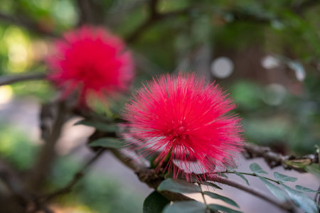 red powderpuff flowers, calliandra haematocephala tree in the outdoor