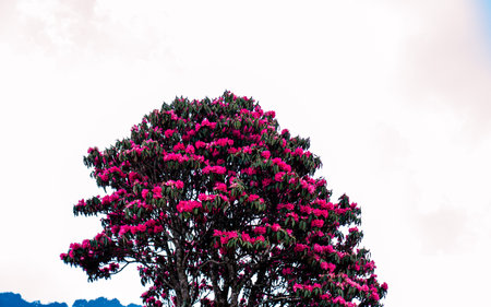 Pink rhododendron flowers on the tree, at Panchthar, Nepal.