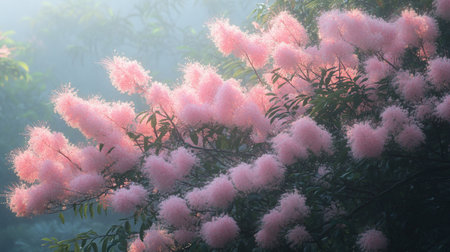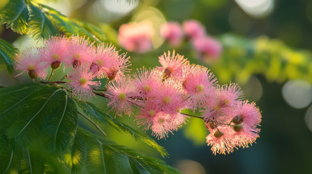 Pink delicate flowers of the blooming Persian silk tree or Albizia julibrissin close up among green leaves on a blurred background