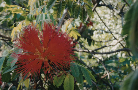Plant known as Calliandra grandiflora, with its red flowers, leaves and branches.