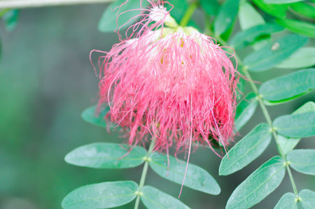 beautiful close up of a Pink Siris or Albizia Julibrissin Flower on Green Background. Albizia Julibrissin is known by a variety of common names: Persian silk tree, pink siris, Lenkoran acacia