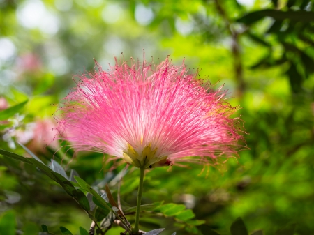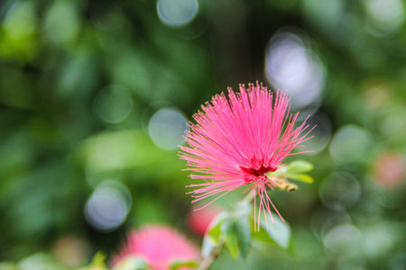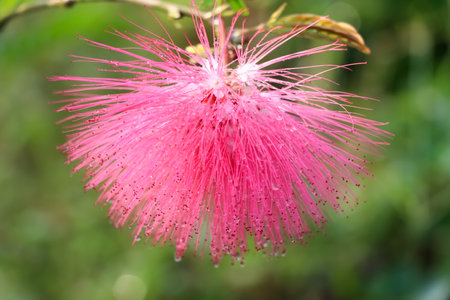 Pink powderpuff flower, shallow DoF(depth of field), Calliandra surinamensis, Family Mimosaceae, common names Pink Powder Puff, Pompon De Marin, Surinam Powderpuff, Surinamese Stickpea