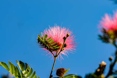 Fluffy pink flower of pink powder puff on a sunny day. Closeup