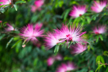 Fluffy pink flowers of pink powder puff closeup. Blurred green leaves background