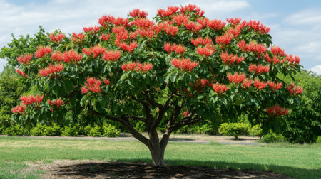 Tree with red flowers on blue sky background. Panoramic view