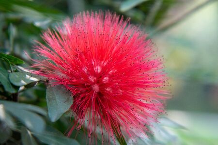 Red Fluffy Powderpuff Flower Blooming in The Garden.